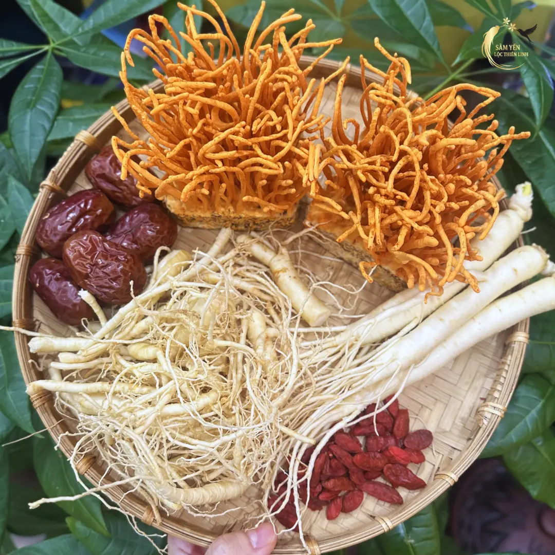 • 🌿 Thành phần: Nâng cấp với 3 củ sâm Hàn Quốc 6 năm tuổi (Size 20-22 củ/kg), Rễ Sâm, Nấm Đông trùng hạ thảo tươi, Táo đỏ, Kỷ tử và cốt men lá Hòa Bình.